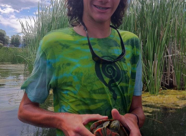 The break in the clouds that puts blue sky around Will’s head is partly within the photographer’s control, but the first item of uncanny perfection. The blue of the sky is matched perfectly by the streak of blue on the sleeves of the tie-dye shirt as well as by the scorpion designs on the hat. The hunter orange of the cap is the perfect complimentary color to contrast the blue sky and so is the yellow-green of the shirt (according to complimentary color theory blue and orange and yellow-green and reddish-orange are complimentary opposites). The shirt has an organically variegated pattern, a vertically aligned banding. The central part of the shirt’s design has a segmented structure longitudinally divided as if by a spine and this parallels the underside of the turtle’s shell. The banded pattern of the turtle’s head and soft tissue matches the banding of the shirt in an amazing way. And if this wasn’t enough uncanny perfection—the orange of the turtle’s undershell matches the orange of the hat as the two green hues of the reeds match the two green hues of the tie-dye. Even more amazing, Will is standing in the midst of the reeds as if it were a group photo of Will and the reeds. This is an uncanny parallelism because Will is a tall and reedy kind of guy! And of course Will’s expression is perfect, eyes directly gazing at the viewer. All the elements coalesce to tell a single coherent story—the joyous discovery of a beautiful turtle in a reedy pond.